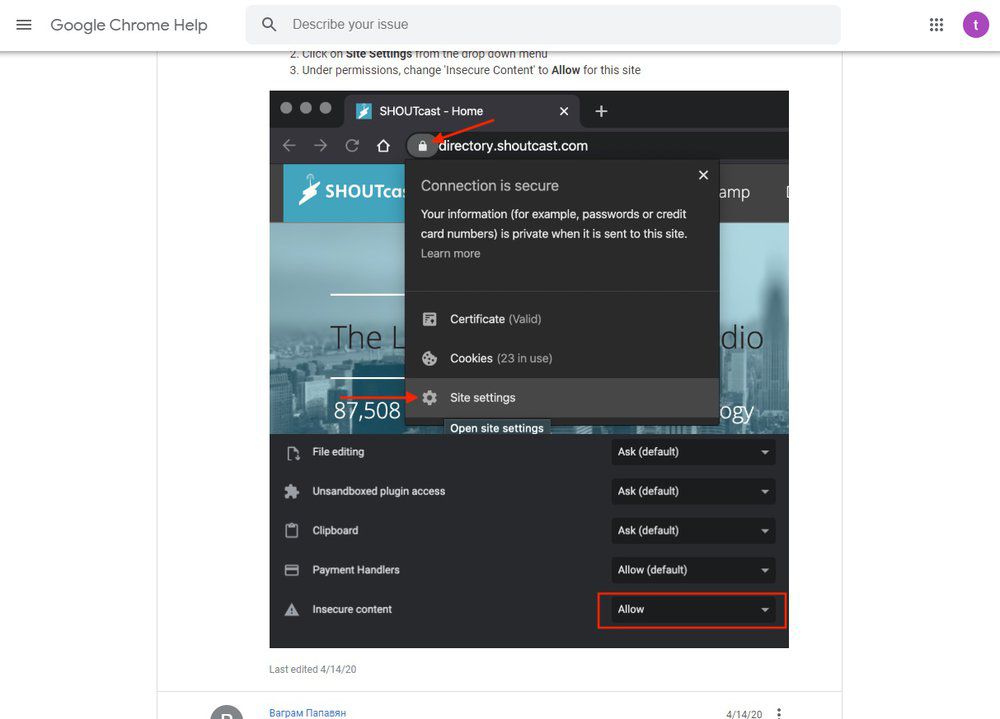 A Engedélyek (Permissions) résznél keresd meg a Nem biztonságos tartalom (Insecure Content) opciót.